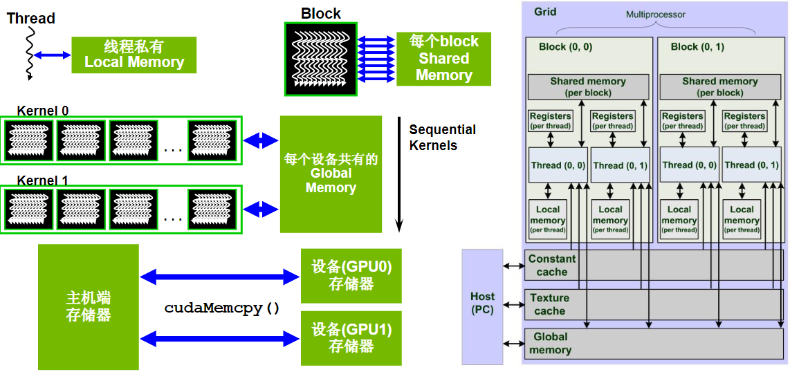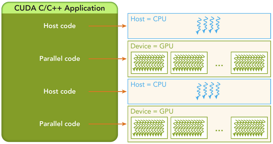 GPU 编程通常是异构环境(多个CPU,GPU),CPU 和 GPU 通过 PCIe 总线相互通信,也是通过 PCIe 总线分隔开的。所以,我们需要区分CPU及其内存 和 GPU及其内存。