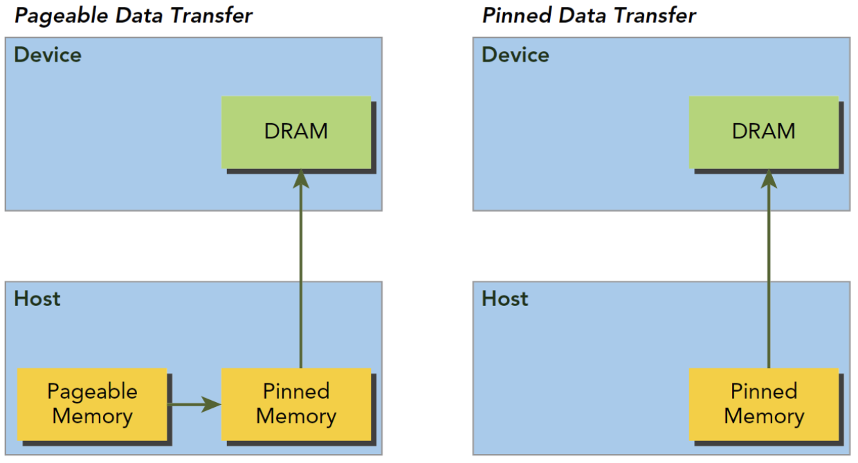 如 Fig 10 所示,CUDA 默认采用淋湿缓冲区复制的方法。同时,CUDA 支持锁页机制,通过使用下面的 API 分配/释放 固定内存,这些内存是页面锁定的,可以直接传输到设备的。