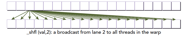 __shfl_sync:最通用的版本,任意 lane 寻址,从指定的 srcLane 线程取 var 值,即将 srcLane 的 var 值数据广播到所有 mask 的线程中,如下图示例所示。1