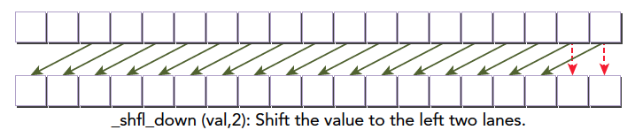 而 __shfl_down_sync从结果看,当前 lane 线程获取lane + delta线程的val寄存器数据,具体示例如下图所示。
