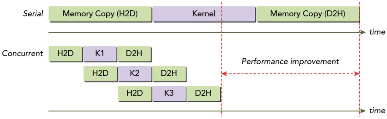 隐式声明的流(空流)无法管理,必须显示声明(非空流)。基于流的异步内核启动和数据传输支持以下类型的粗粒度并发: