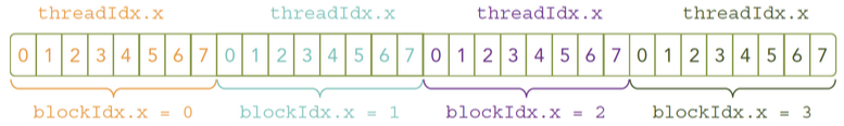 下面是一个示例,当配置为 «<4, 8»>,即 block = 4, thread = 8 时,核函数的线程分配如图 Fig 4 所示。