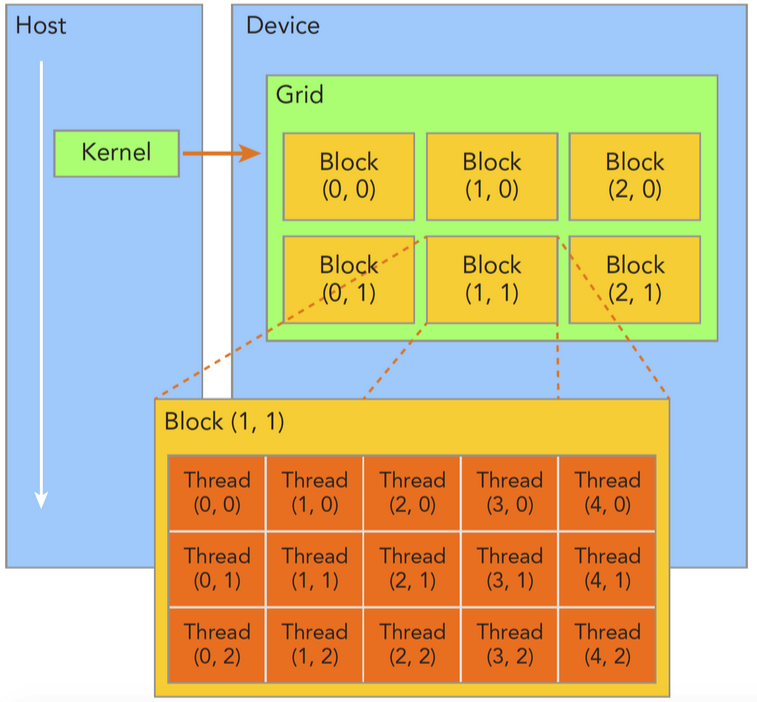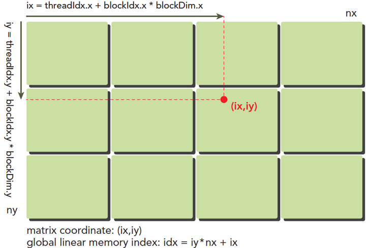 核函数是同时复制到多个线程执行。为了让多个线程对应到不同的数据,需要给线程一个唯一的标识,由于设备内存是线性的,我们可以根据 threadIdx 和 blockIdx 来组合获得对应的线程的唯一标识,如 Fig 5 所示。