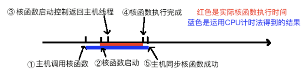 但是,由于核函数与主机程序是异步的,且具有启动开销,使用 clock() 统计的时间一般偏大,具体如下图 Fig 6 所示。